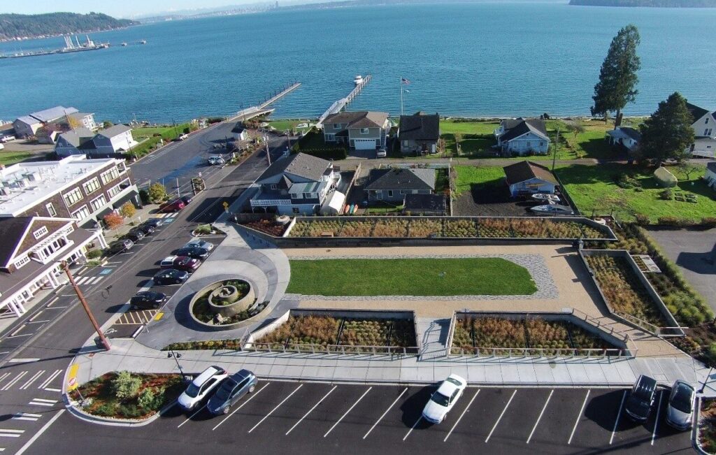 Other project elements include a new 36-inch diameter outfall, a new public pier, and beach restoration. Over 1 mile of urban arterial streets were also reconstructed into complete streets with green stormwater infrastructure. The project was funded by a combination of local funds and state grants, and included extensive work with Ecology for approval of the innovative stormwater park treatment system as well as outreach with the affected community.