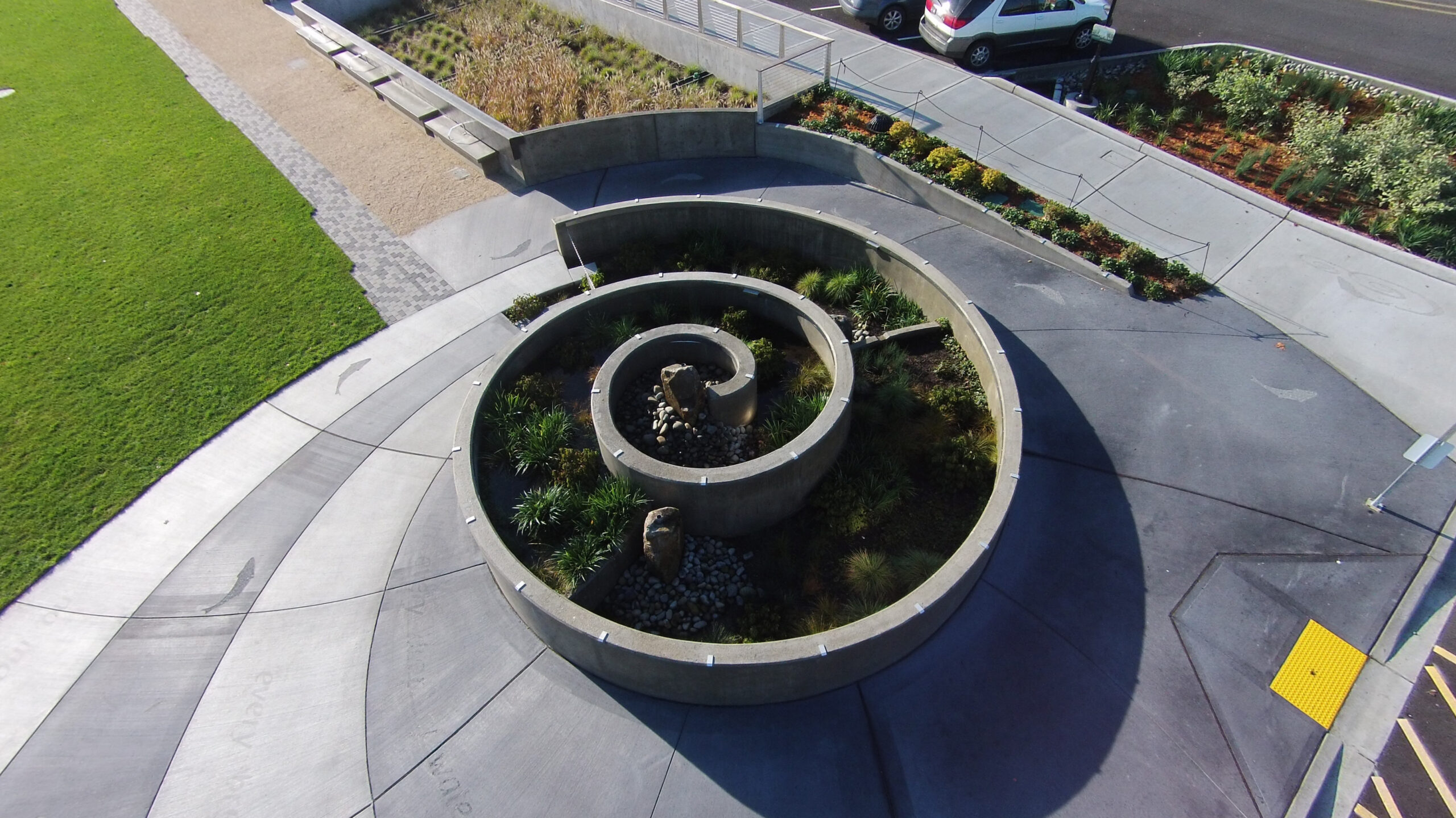 Manchester is an urban waterfront community that has been designated as a high-priority area for water quality and flood control. The downtown area was prone to seasonal flooding and ponding. This situation had to be addressed while still maintaining Manchester’s desire to develop a rural village center and retain its quaint small-town charm. The goal was to enhance water quality by constructing a variety of green stormwater infrastructure for the 100-acre basin, including bioretention, modular wetlands, and a vault filter system within a new community stormwater park. The new 2-acre stormwater park features a spiral rain garden that is the main architectural element of the park and also treats light rainfall and ground water. The concrete around the spiral garden wall features a poem etched into it that can only be seen when the concrete is damp. The park has a large grass meeting space, colored gravel and brick walking paths, stone benches, light stanchions, and bike stands.