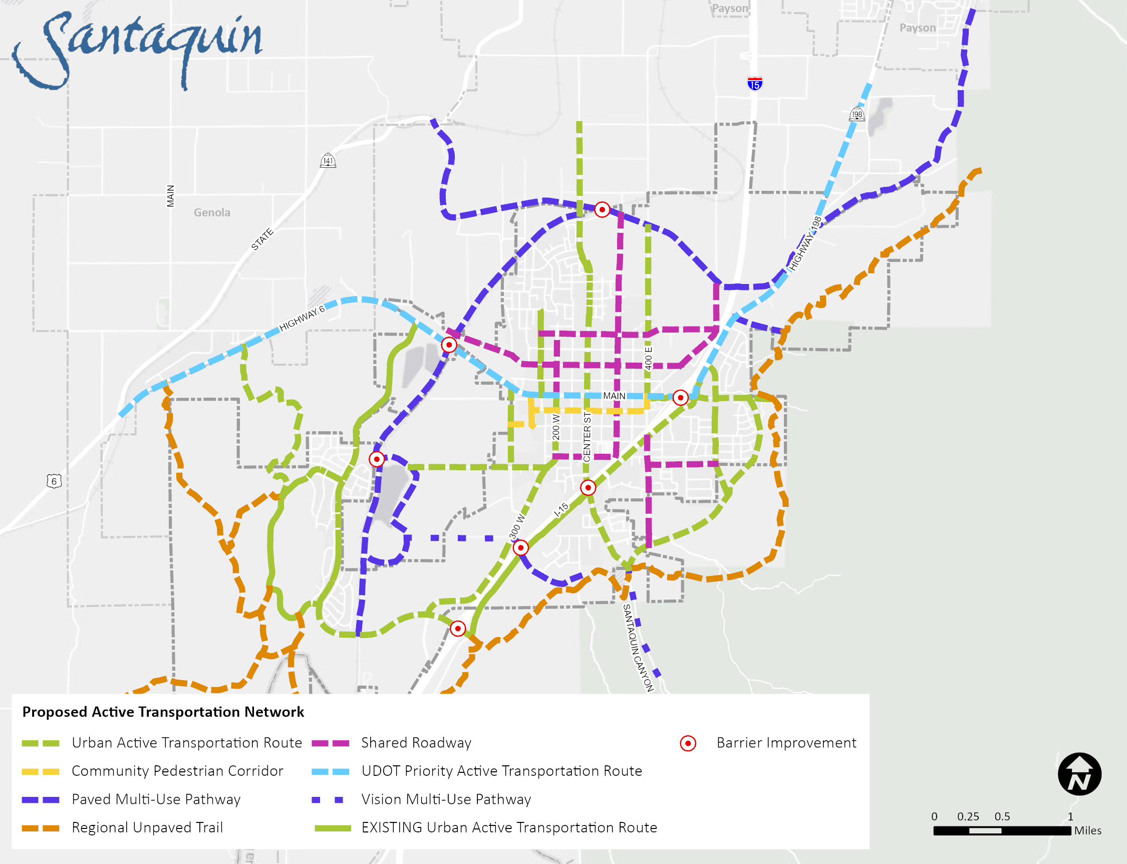 The Santaquin Active Transportation Plan was a joint effort between Santaquin City and UDOT. Parametrix developed a comprehensive active transportation network for the city with a variety of facility types, from shared roadways to multi-use pathways.